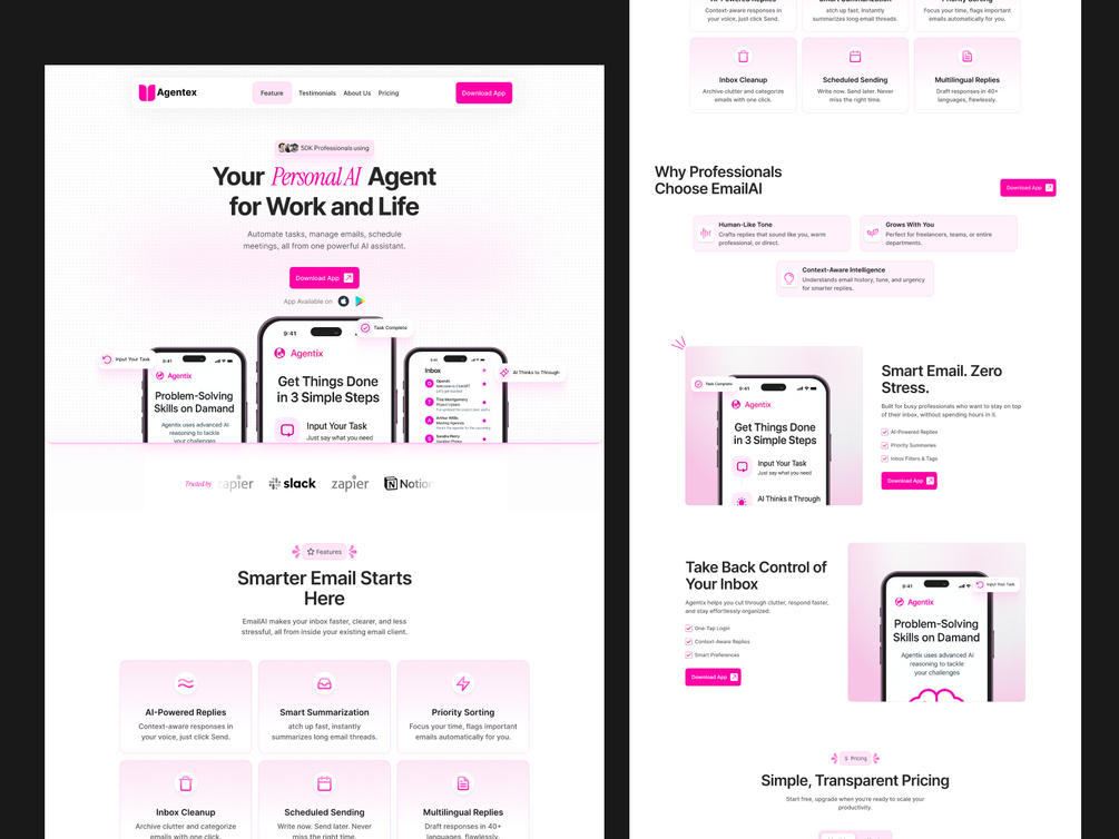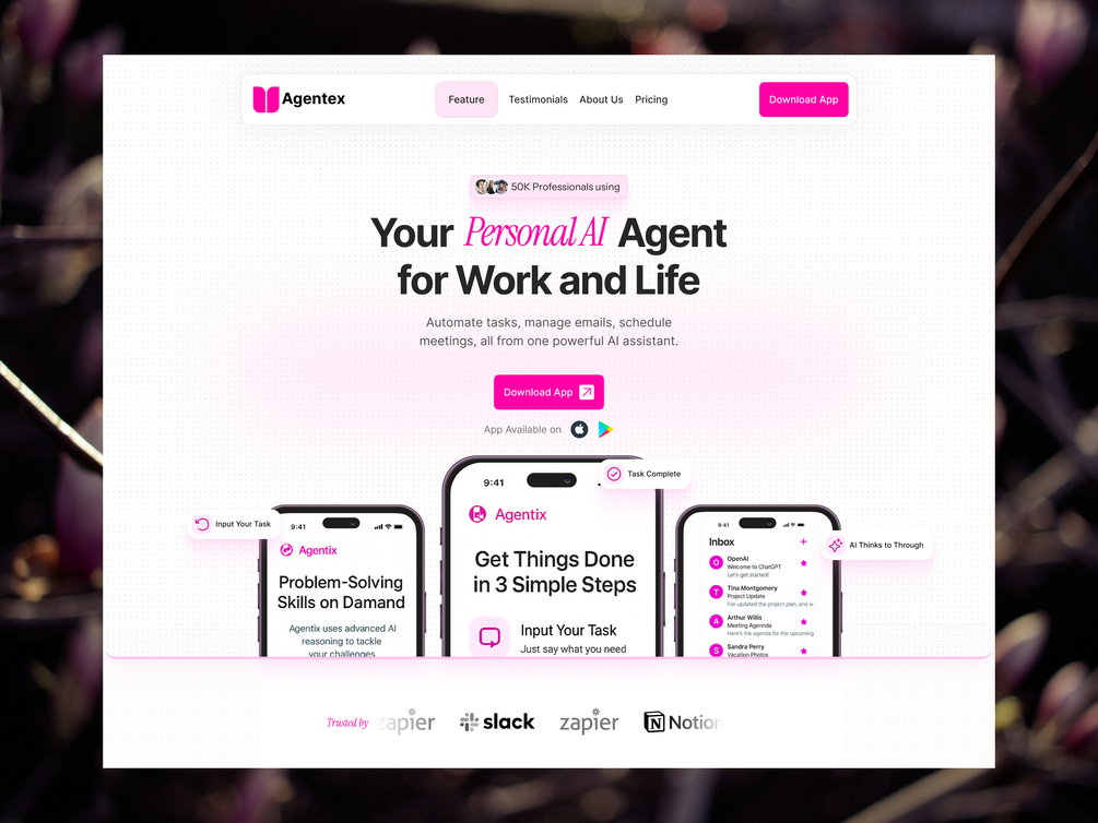 Agentex is a high-converting, mobile-first Framer template built specifically for AI-powered mobile apps, productivity tools, and SaaS startups. Whether you're building an AI email assistant, a smart productivity app, or a solopreneur tool, Agentix helps you showcase your product, build trust, and drive app downloads effortlessly.